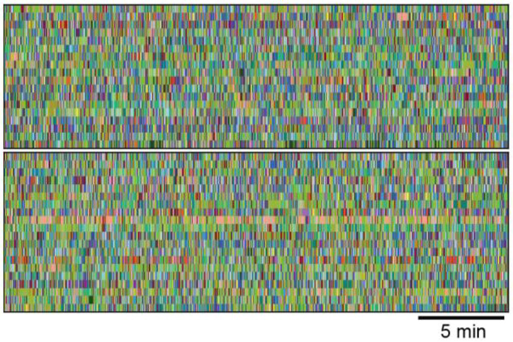 The machine-learning technology used in the study, called MoSeq for Motion Sequencing, locates, tracks, and quantifies the behavior of freely moving mice in each frame of the video. The information is used to train the unsupervised machine learning model to identify repeated motifs of behavior (called “syllables” – e.g., a right turn or headbob to the left). MoSeq predicts the order (or “grammar”) in which syllables occur, allowing fast and objective characterization of mouse behavior.