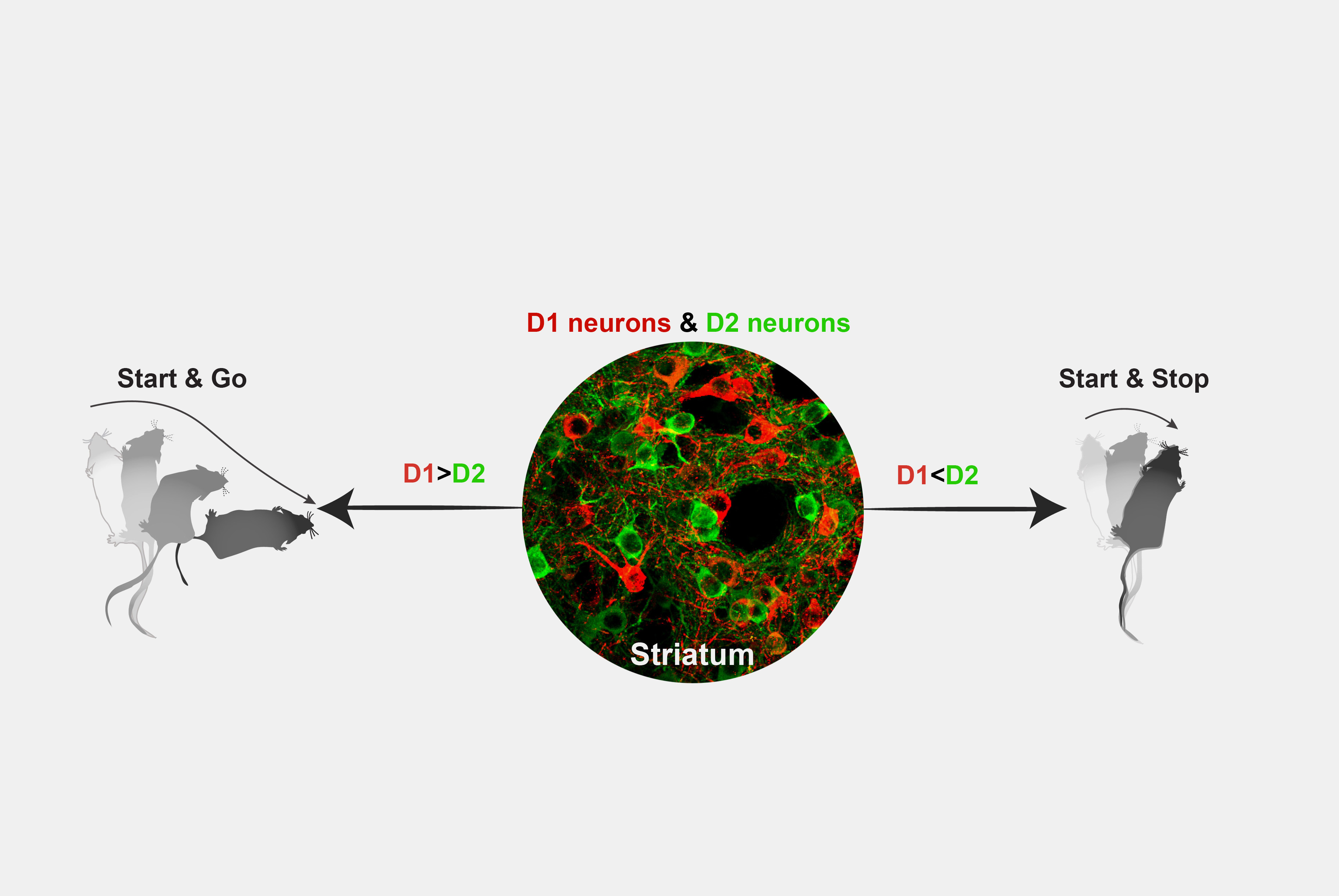 With SRFP, Cui and colleagues found that when neural activity in D1 neurons is stronger than D2 neurons, the animal does a start and go, which means it starts and moves to another location. But, when the activity of D2 neurons is stronger than D1 neurons, the mouse does a start and stop, meaning it initiates a movement, but stops immediately.