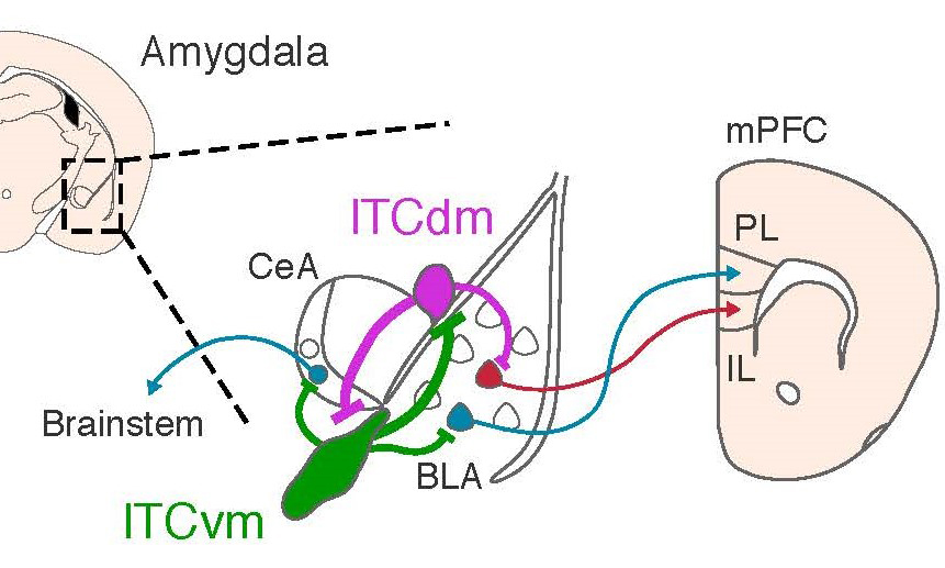 The researchers found that two distinct ITC clusters promote either a fear response or extinction of the cue / foot-shock association. They further revealed that the clusters effectively compete with one another, through a process known as mutual synaptic inhibition, to determine the relative strength of each memory and, hence, the level of defensive behavior shown by the animal. The study also showed that the ITC clusters have long-range connections to known fear-regulating regions in the midbrain and prefrontal cortex.